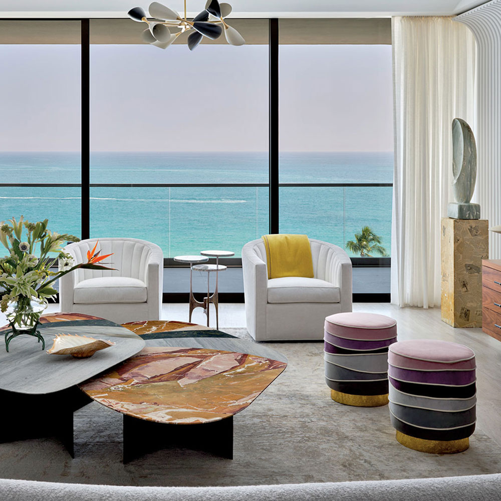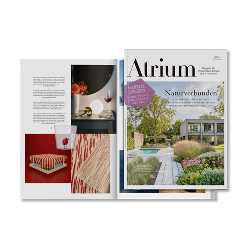 Atrium magazine, March-April 2024, featuring the Op-Art center table in red tones.